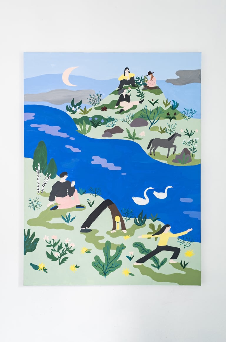 Delving into folklore, the historical meaning of plants and searching for a personal connection with the natural world of Vilnius, the multi-colored ceramic series "Raizgės", acrylic paintings, and flags dyed with natural vegetable dyes were created using the traditional textile dyeing techniques.